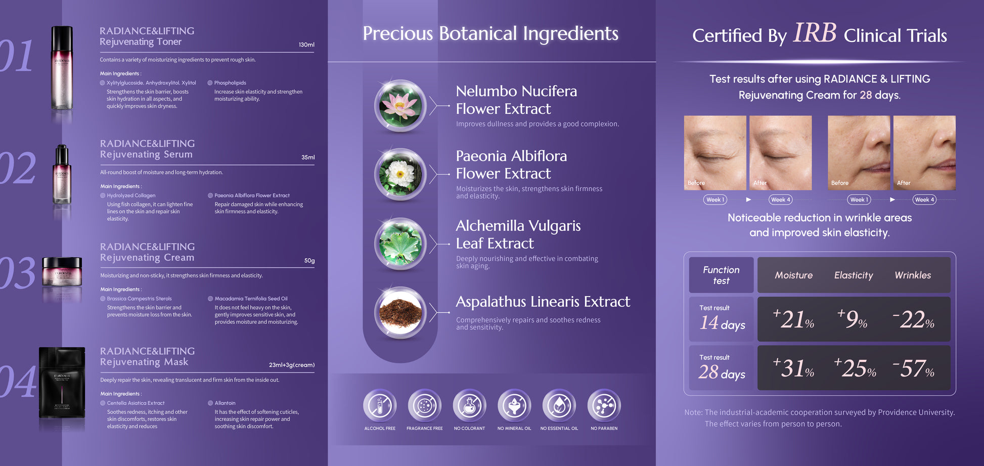 Raeonia Albiflora Flower Extract: Repair damaged skin while enhancing skin firmness and elasticity.